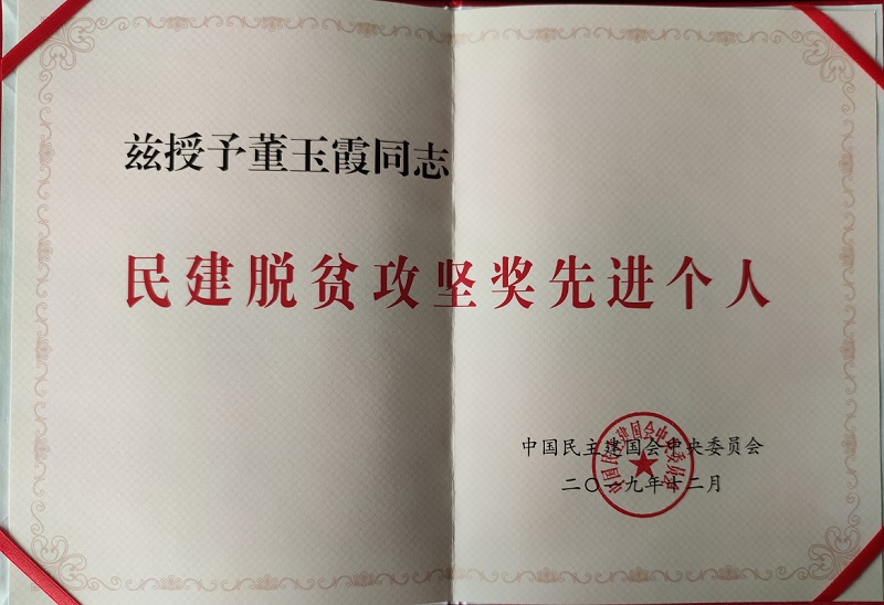 董玉霞理事长荣获民建中央委员会授予的全国“民建脱贫攻坚奖先进个人”荣誉称号。