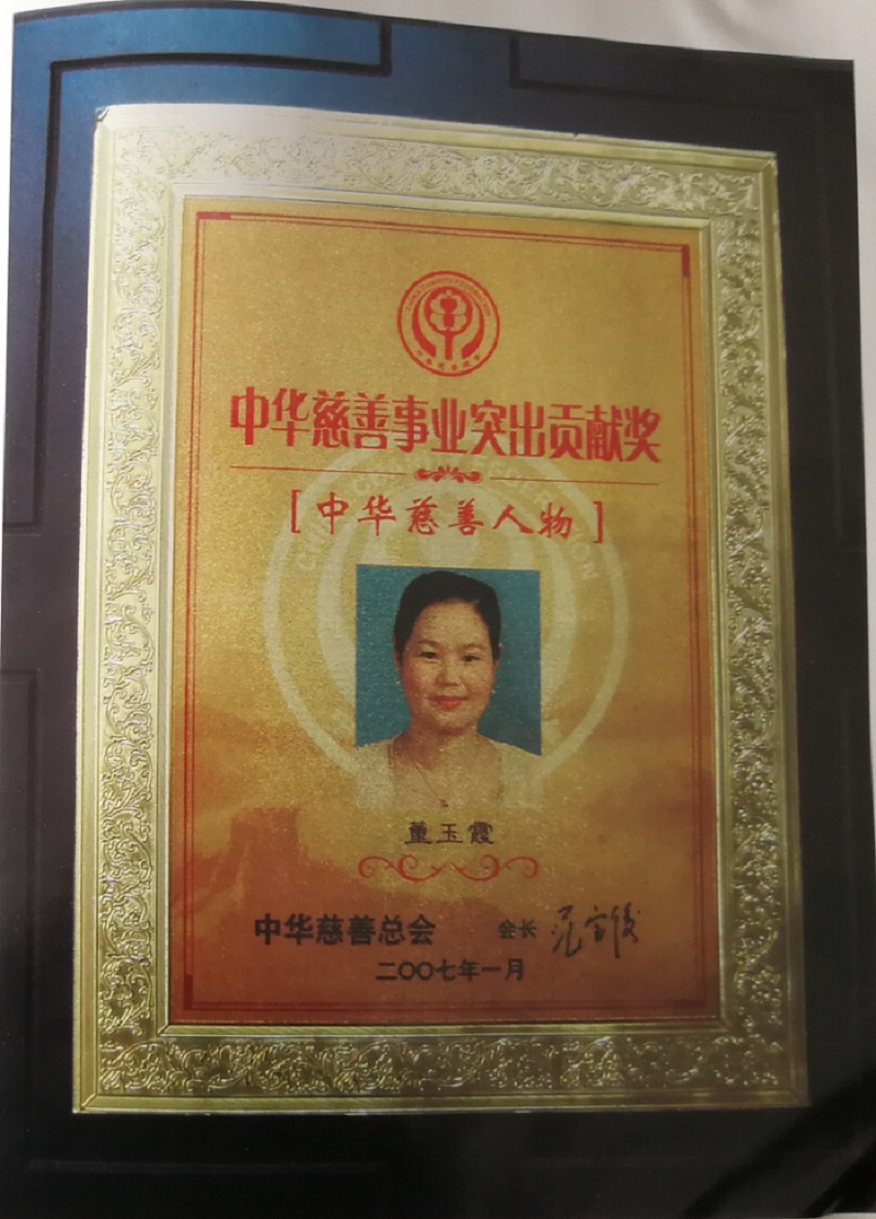 董玉霞理事长荣获国家民政部授予的“中华慈善事业突出贡献奖”荣誉称号。