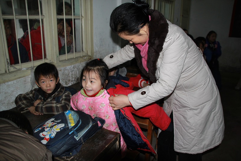 当天下午,天空中开始飘着毛毛细雨,可这仍然没有阻挡送温暖队伍前行的脚步。当满满一教室的孩子们,看到董玉霞理事长和殷克慧画家走进教室时,一张张稚嫩的脸上露出欣喜的神色,孩子们开心的喊着:“妈妈好~!欢迎妈妈!”董玉霞理事长将衣服一件件的分发给每一位孩子,亲自为孩子们穿上新衣服,并说道:“穿上温暖的衣服,就如同感受到社会大众对你们的关怀。希望孩子们能够好好读书,用好成绩来回报这些关心你们人。”